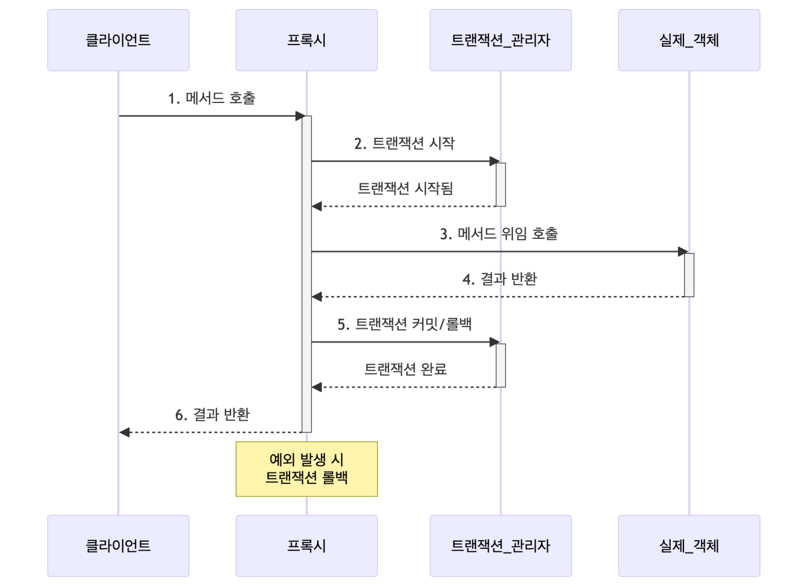 트랜잭션 완료: 메서드 실행이 완료되면, 프록시는 트랜잭션을 커밋하거나 롤백합니다.